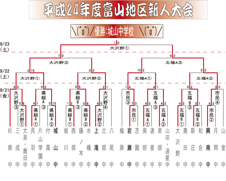 | チーム | 新庄中 | 大沢野中 | ||||||
