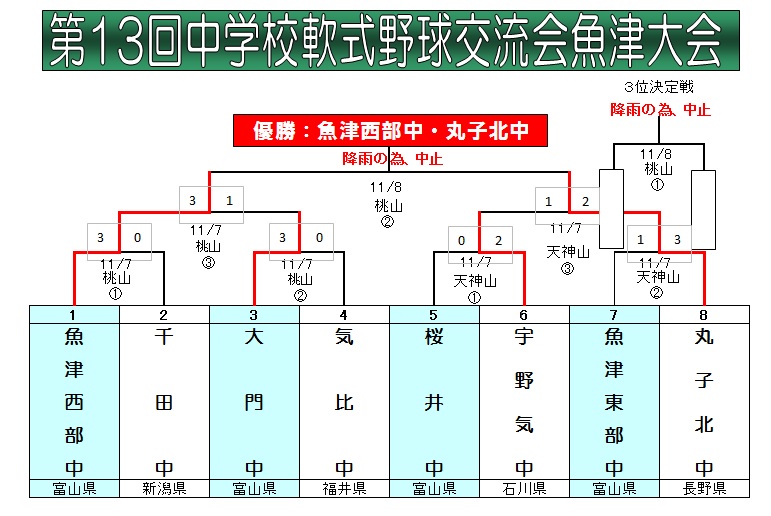 | 最終日は降雨のため中止。決勝に進出した魚津西部、丸子北の両校優勝。 | |||||||||