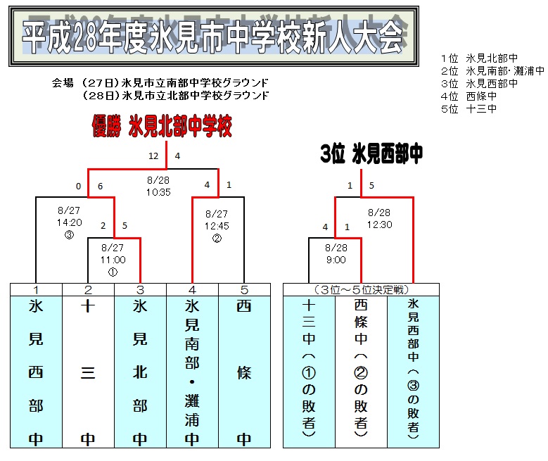 | 氷見西部中 | 4 | 0 | 0 | 0 | 1 | 0 | × | 5 |
