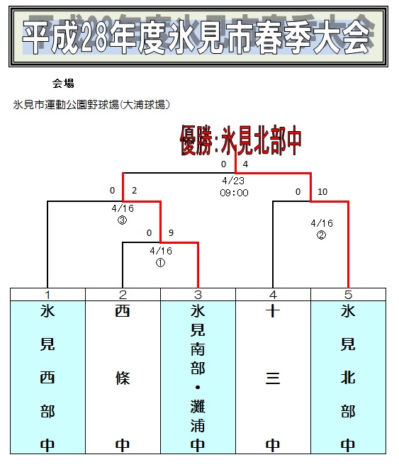 | 氷見北部中 | 1 | 0 | 2 | 0 | 1 | 0 | 0 | 4 |