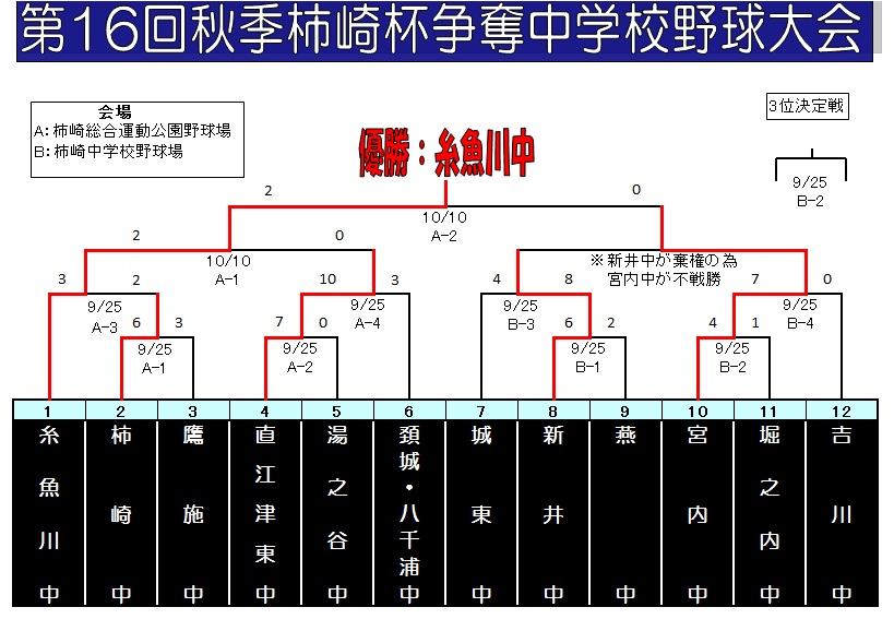 | 同時期に開催される『新潟県新人大会(オンヨネ杯)』で降雨による日程変更が生じたのに伴い今大会の日程も「初日・9月25日」、「最終日・10月10日」へと変更。 | |||||||||