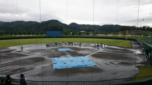 庄西ー入善西戦。中断中のグラウンドの様子。