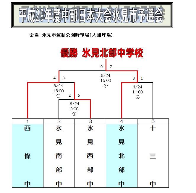 | 氷見西部中 | 2 | 0 | 1 | 2 | 1 | 0 | × | 6 |