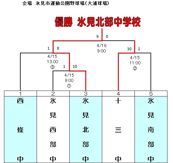 | 北部中 | 7 | 0 | 2 | 0 | × | 9 | ||