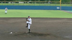 | 一日2試合を投げ抜いた前馬投手(大門)。 |