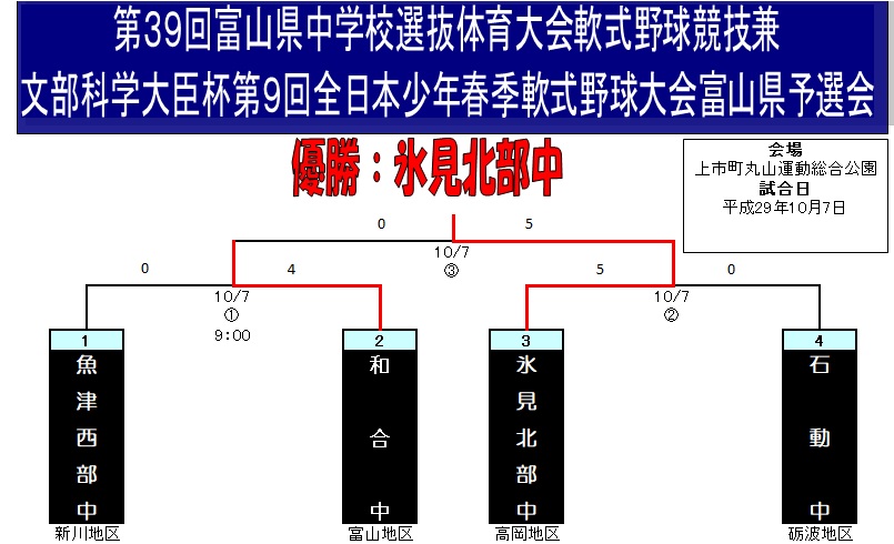 | ◆決 勝 | ※氷見北部は3年ぶり昭和63年以降5度目の優勝。県軟式野球連盟の推薦も得て『第9回全日本少年春季大会北信越予選(10月28日・長野市)』への3年ぶり5度目の出場が決定。準優勝・和合は同連盟の推薦も得て『第20回関東・北信越少年大会(11月・宇都宮市)』への初出場が決定。 | |||||||||||||