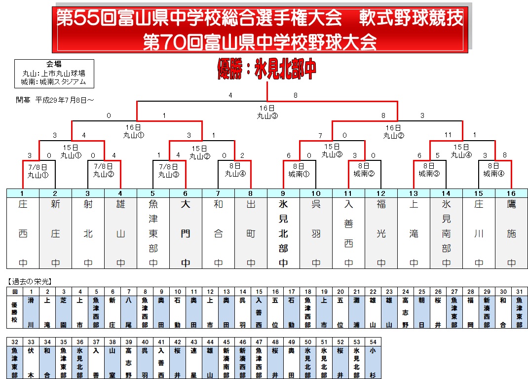 | 氷見北部 | 2 | 2 | 0 | 2 | 0 | 2 | x | 8 |