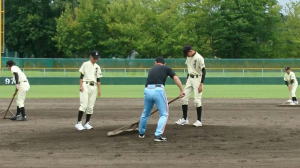 ![]() 試合の合間には桑田さん自らグラウンド整備。 |