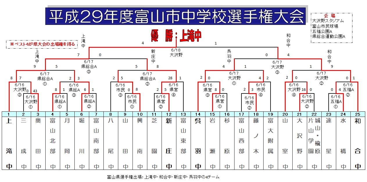 | 水橋中 | 3 | 1 | 0 | 0 | 0 | 0 | × | 4 |