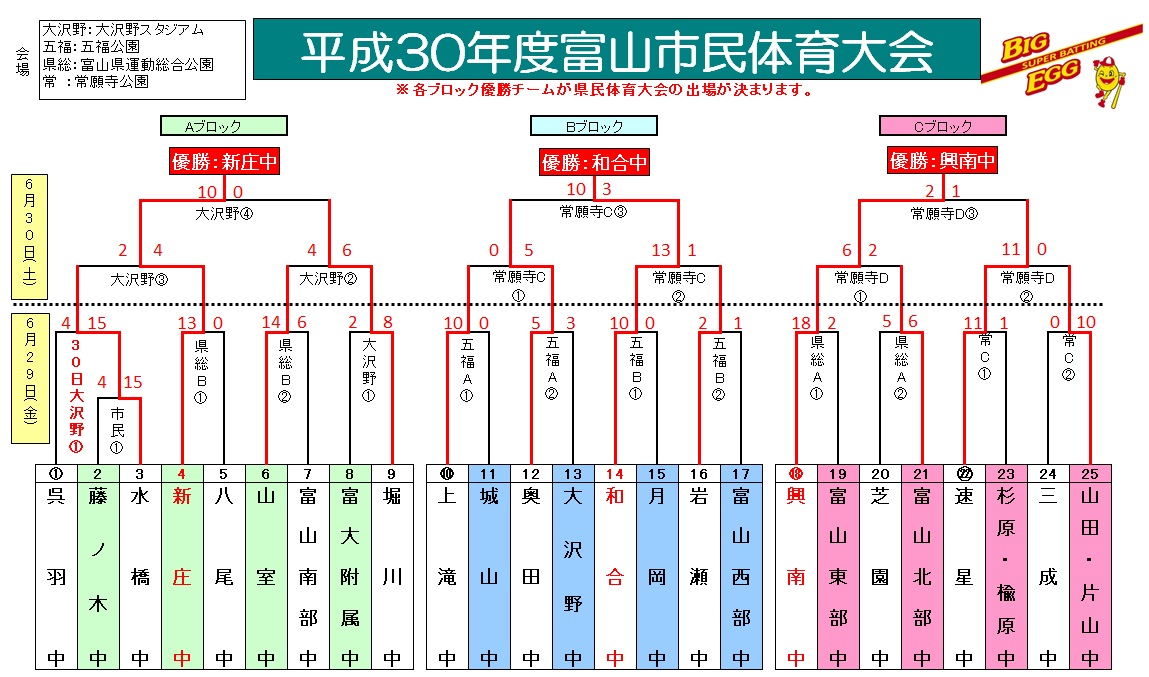 | 大沢野中 | 3 | 0 | 0 | 0 | 0 | 0 | 0 | 3 |