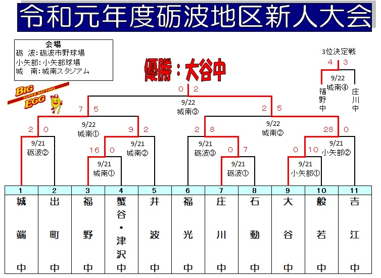 | 大谷中 | 0 | 0 | 0 | 0 | 0 | 2 | × | 2 | ||||||||||||