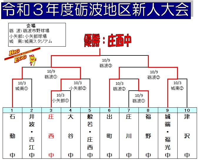 | 出町中 | 0 | 2 | 0 | 3 | 0 | 0 | × | 5 | ||||||||||||||