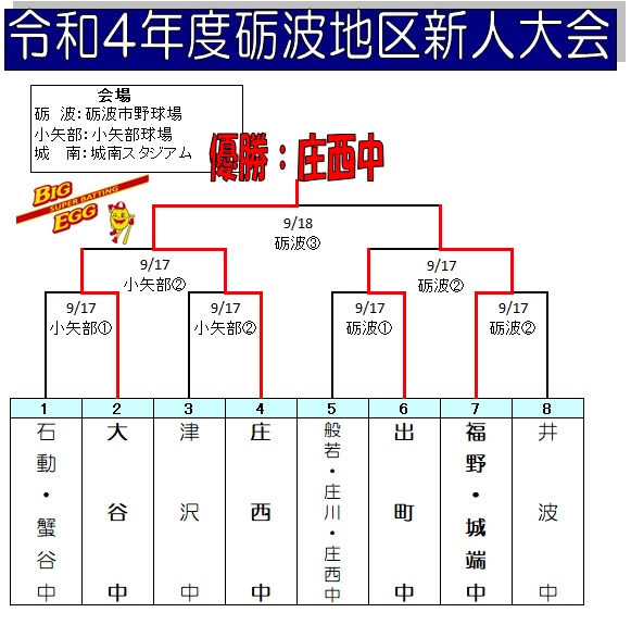 | 福野中・城端中 | 2 | 0 | 6 | 1 | 0 | × | 9 | |||||||||||||