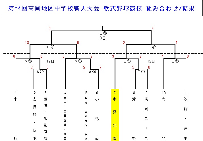 | 第54回高岡地区新人大会 1位 氷見市立北部中学校 2位 氷見市立西條中学校・氷見市立南部中学校 3位 射水市立大門中学校 3位 高岡市立国吉義務教育学校・高岡市立高岡西部中学校・高岡市立福岡中学校 上記の氷見市立北部中学校は県大会に出場します。 |