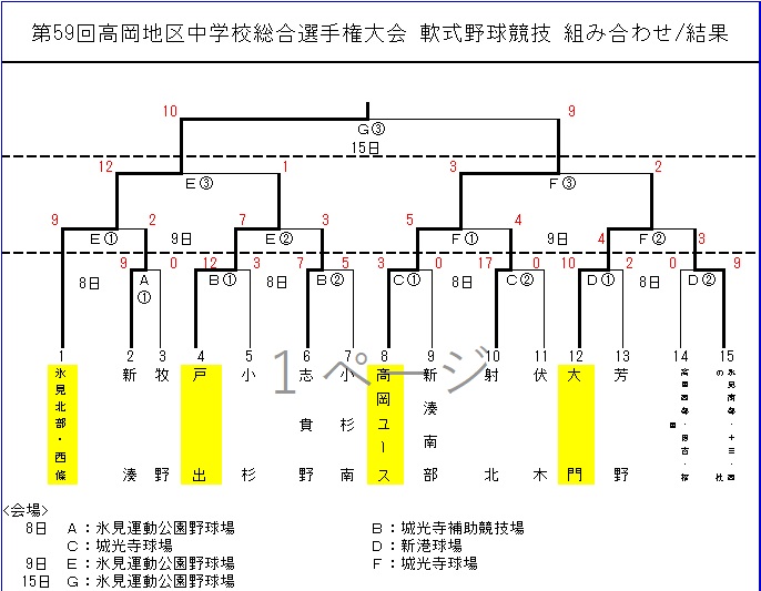 | 第59回高岡地区選手権大会 1位 氷見市立北部中学校・氷見市立西條中学校 2位 高岡ユース 3位 高岡市立戸出中学校 3位 射水市立大門中学校 上記の4校は県選手権大会に出場します。 |