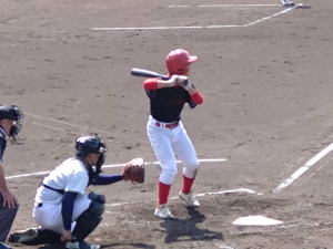| 完封勝利の石村投手(富山野球ク)。 | 先制二塁打の石井主将(富山野球ク)。 | ||